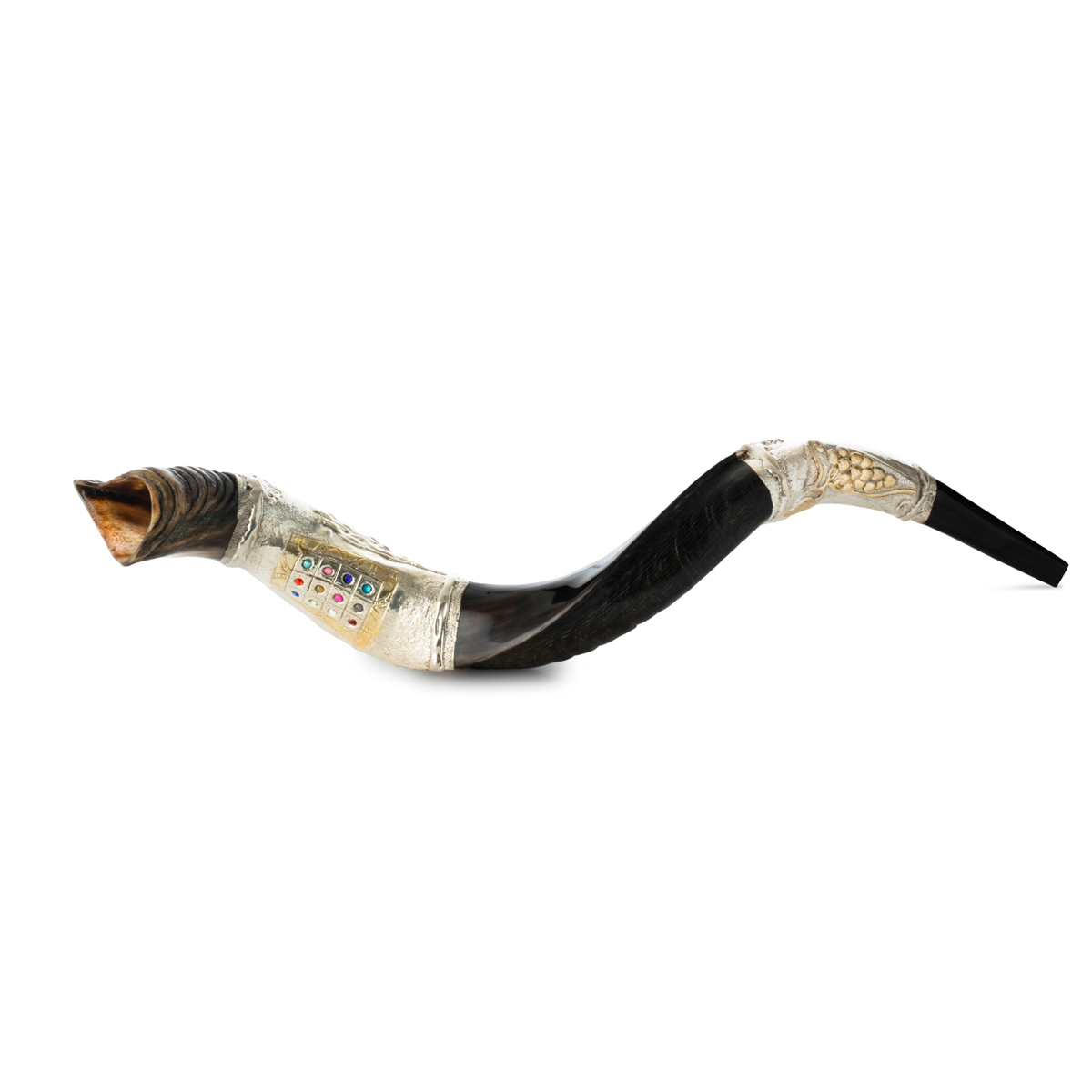 שופר תימני בינוני בעיטור כסף "אבני החושן" על סטנד