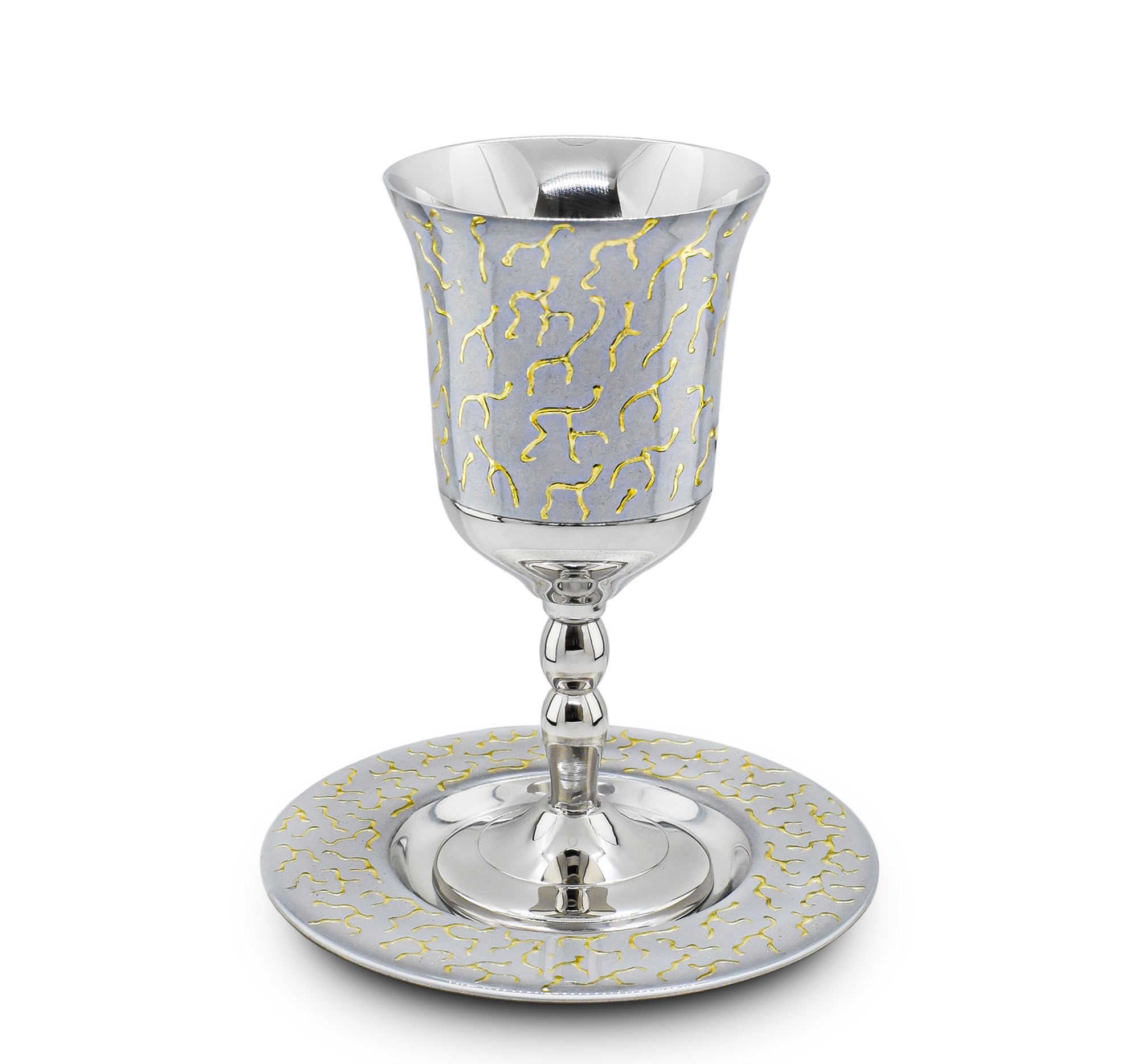 כוס קידוש על רגל/תחתית נירוסטה/אמייל אפור/ענפים צבע זהב