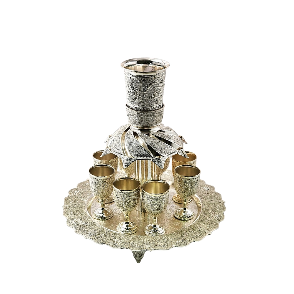 סט מפלים+מגש+8 גביעים פיליגרן מוכסף