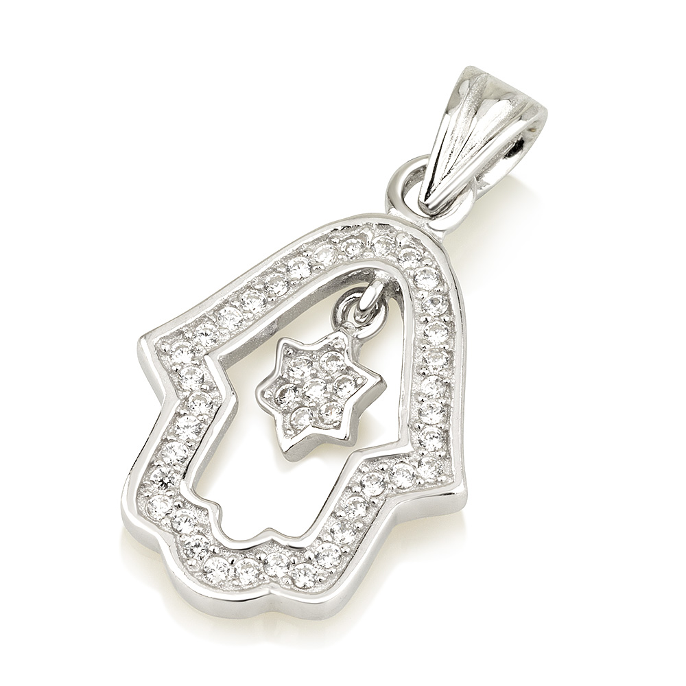 תליון מגן דוד בתוך חמסה כסף ואבני זרקון לבן