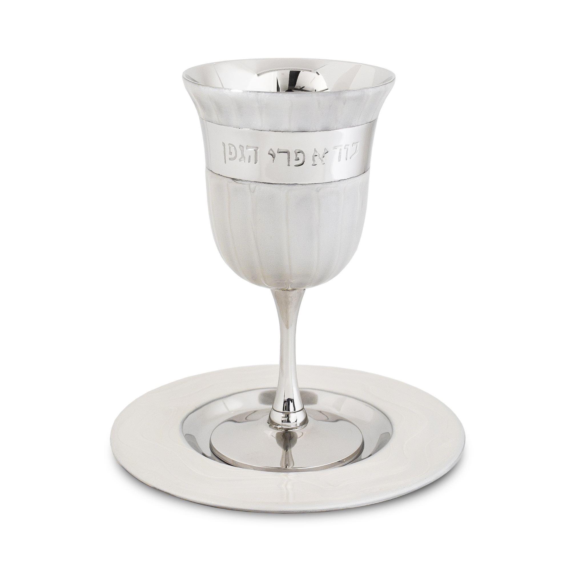 כוס קידוש על רגל/תחתית אמייל לבן "בורא פרי"