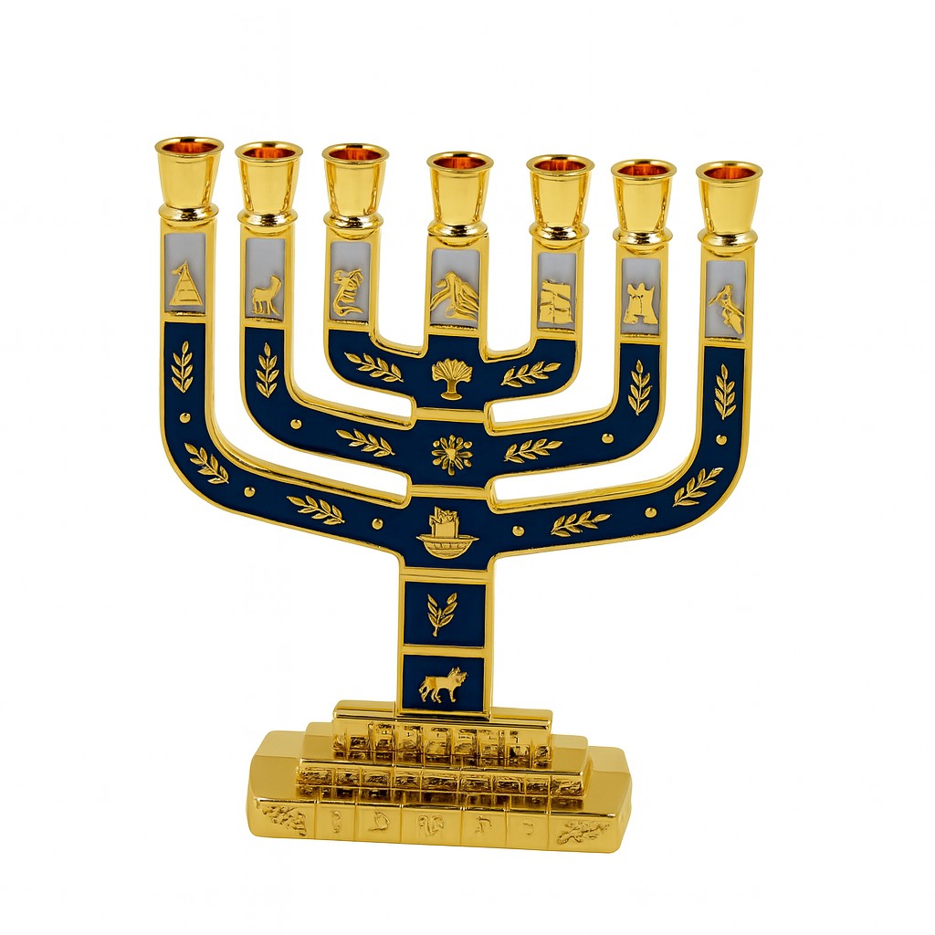 מנורה שבטים מרובעת צבע זהב/אמייל כחול ולבן 10 ס"מ